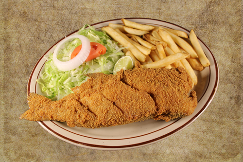 Whole farm raised catfish, breaded and deep fried. Served with a cup of fish soup, fries and salad