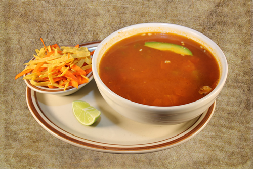 Chicken broth-based soup with diced chicken, crispy tortilla strips, vegetables, cheese and avocado.